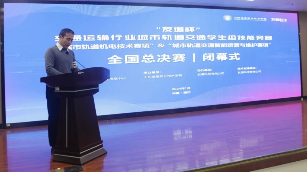 交通運(yùn)輸部職業(yè)資格中心黨委委員、副主任孫海在講話中肯定了山東信息職業(yè)技術(shù)學(xué)院作為承辦單位及友道科技有限公司作為協(xié)辦單位、技術(shù)支持單位為賽事付出的努力。他表示,本次競賽內(nèi)容豐富,“實(shí)戰(zhàn)”色彩鮮明,具有很強(qiáng)的專業(yè)性、競技性、實(shí)用性。通過比賽,進(jìn)一步激發(fā)了行業(yè)、企業(yè)、學(xué)校和社會(huì)各方的積極性主動(dòng)性,促進(jìn)學(xué)練賽一體,深化產(chǎn)學(xué)研融合,使職業(yè)院校所培養(yǎng)的技術(shù)技能型人才更加符合城市軌道交通行業(yè)實(shí)際需要。